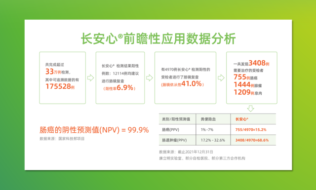 糞便DNA檢測技術(shù),正成為腸癌篩查中的重要一環(huán)。康立明生物首席市場官鄧曉琴發(fā)布的腸癌糞便基因檢測產(chǎn)品“長安心”最新前瞻性應(yīng)用數(shù)據(jù)顯示,截至2021年12月,長安心共完成33萬例前瞻性篩查,其中175528例篩查數(shù)據(jù)可追溯,12114例受檢者檢測結(jié)果陽性(陽性率6.9%),其中4970例檢測結(jié)果陽性的受檢者進(jìn)行了腸鏡復(fù)查(腸鏡依從性41.0%),一共發(fā)現(xiàn)3408例需要治療的受檢者,其中755例腸癌,1444例腺瘤,1209例息肉?!伴L安心”對腸道腫瘤的陽性預(yù)測值(PPV)為68.6%(其中腸癌的陽性預(yù)測值為15.2%),來自國家科技部項目的數(shù)據(jù)顯示,長安心的陰性預(yù)測值達(dá)99.9%。
